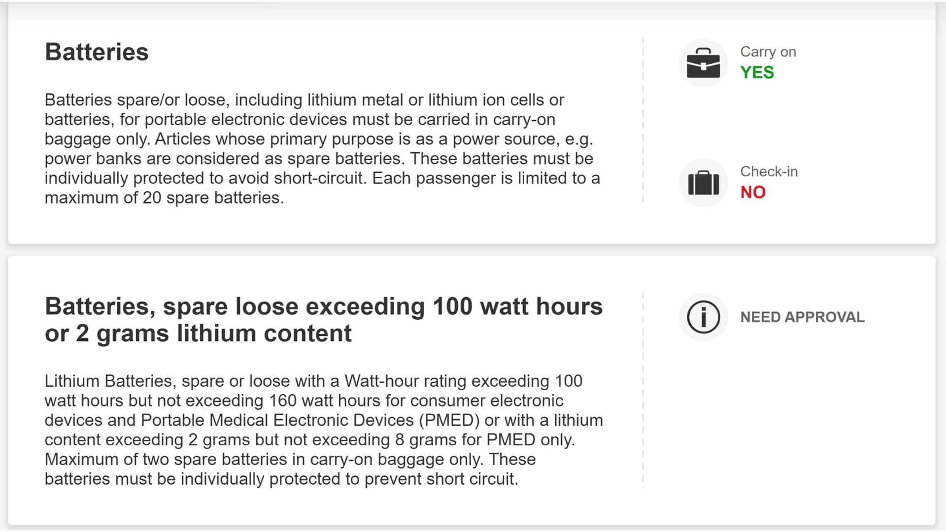 برای مقادیر بالاتر از ۲ تا ۸ گرم لیتیوم باز هم نیاز به مجوز دارید. ظرفیت حمل حداکثر دو عدد در داخل کابین میباشد.
